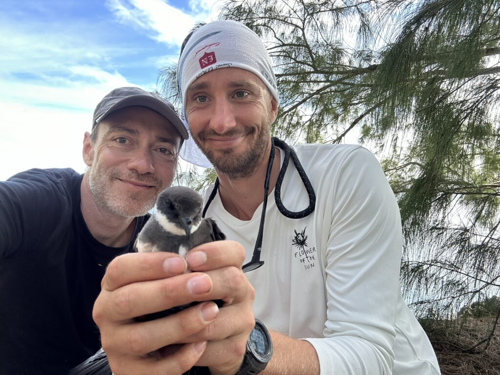 Jacopo G. Cecere and Federico De Pascalis holding a Polynesian storm petrel on Manui, Archipelago of Gambier, French Polynesia